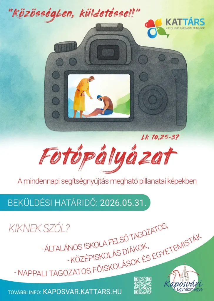 A Kaposvári Egyházmegye „Igazságosabb és testvériesebb világot!” címmel fotópályázatot hirdet határokon innen és határokon túl, katolikus hit- és erkölcstanra, katolikus fakultatív hittanra, valamint katolikus egyházi fenntartású intézményekben katolikus hittanra járó, általános és középiskolás diákoknak, nappali képzésen résztvevő főiskolai és egyetemi hallgatóknak.